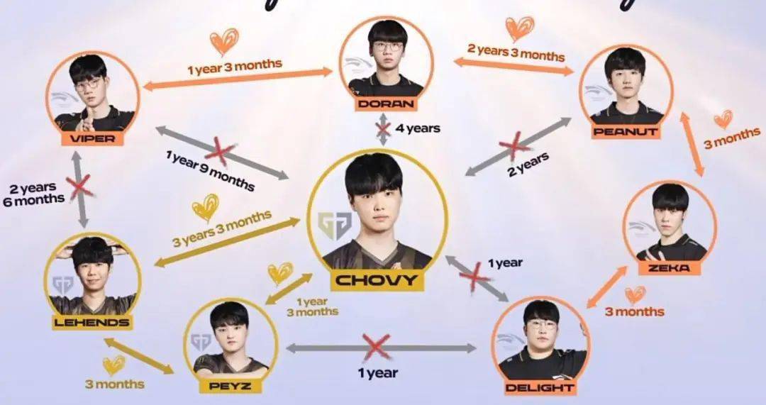Chovy和Peanut在GEN时期当过两年队友,期间Doran也在,Doran和Peanut在转会期是同时离队加盟了HLE,同时Peanut实现了与Zeka的组队,Zeka和之前是Chovy队友的辅助选手Delight组队。