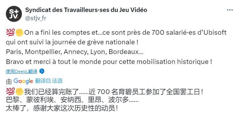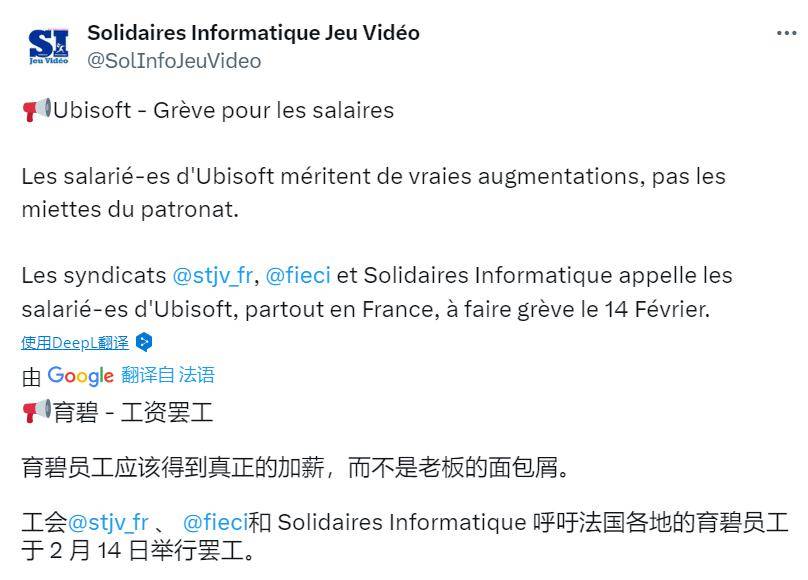 在薪资谈判屡屡碰壁之后,2月14日当天,近700名法国育碧员工在法国游戏工人工会STJV的号召下走上街头,参与了一场为期一天的罢工行动。