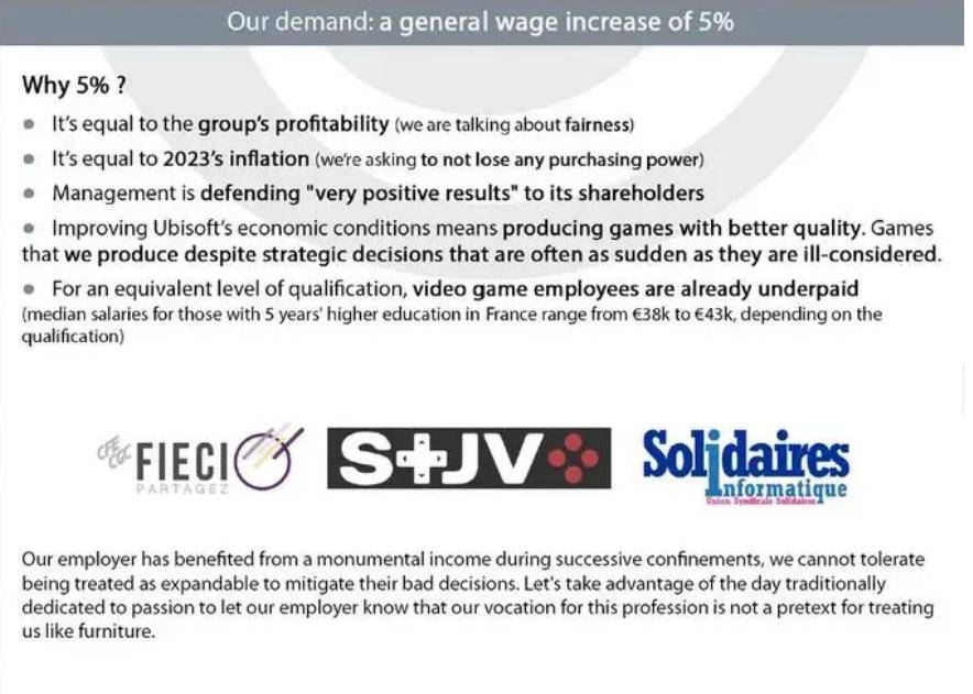 但问题也就出在这里,STJV认为,考虑到育碧的盈利能力,公司为员工们提供的奖励机制非常不平衡,薪资增长已经连续两年落后于通货膨胀率。另一家法国工会Solidaires Informatique同样参与了这场薪资谈判,他们希望法国育碧全体员工涨薪5%,而育碧管理层只愿意视公司情况加薪2-3%。