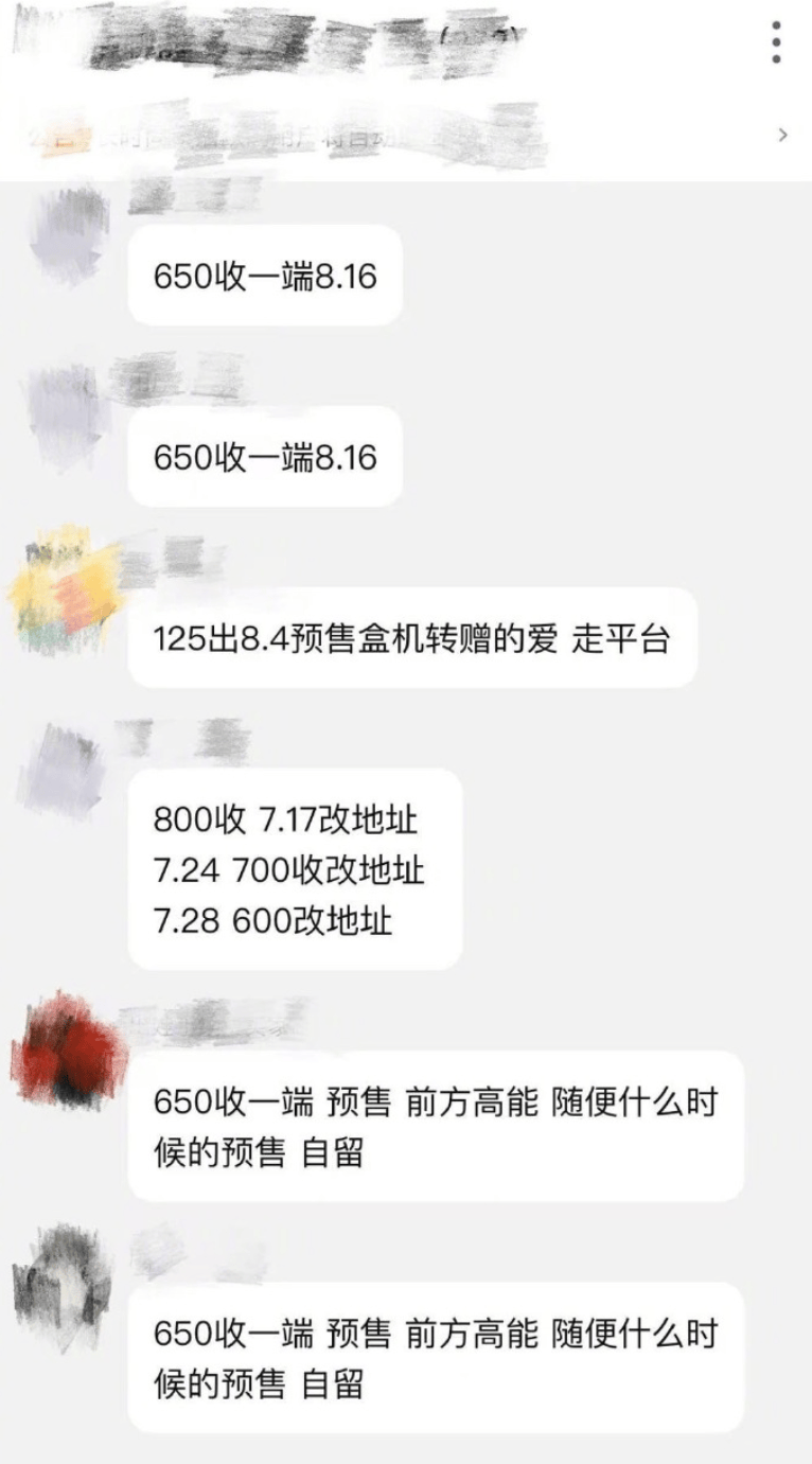 但在黄牛群中,随着预售开启,Labubu3.0系列价格下探,大家普遍出价在650元至800元收一端(整盒内含6个盲盒),也有卖家出价1200元出自己手中抢来的预售,但无人响应,群内有人接话说:“已经崩盘了,700元至800元可收。”有黄牛表示,随着离预售日期越来越远,其给出的报价也递减。