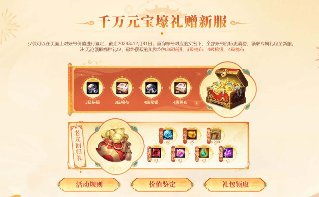 值得一提的是,官方还直接豪横地拿出了千万元宝好礼挥洒新服,玩家们不仅可以根据实名下全部账号的历史消费金额领取专属礼包,和老朋友们共同组队还有更多好礼可以领取,新服同游正是入坑好时候。