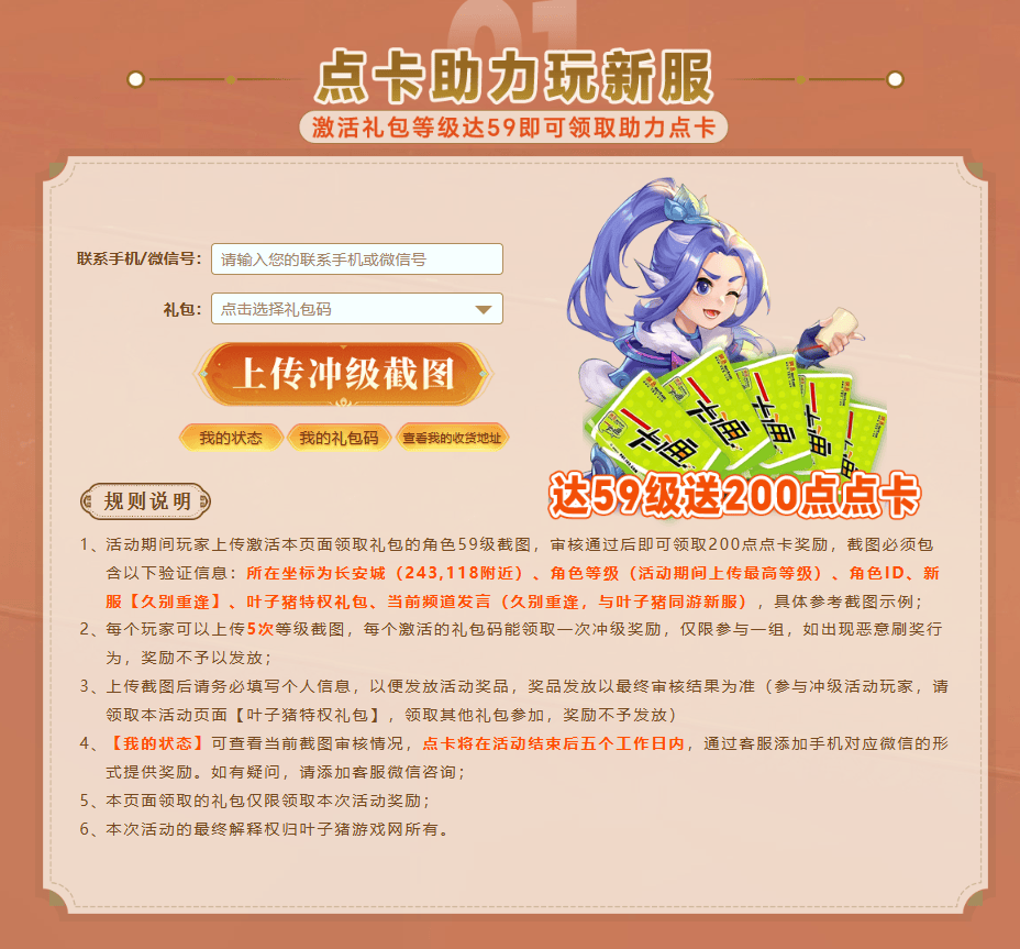 如果你激活礼包并达到59级的话,就可以上传截图领到200点点卡,五开玩家也不用担心,因为每个人都可以领取5次专属福利!