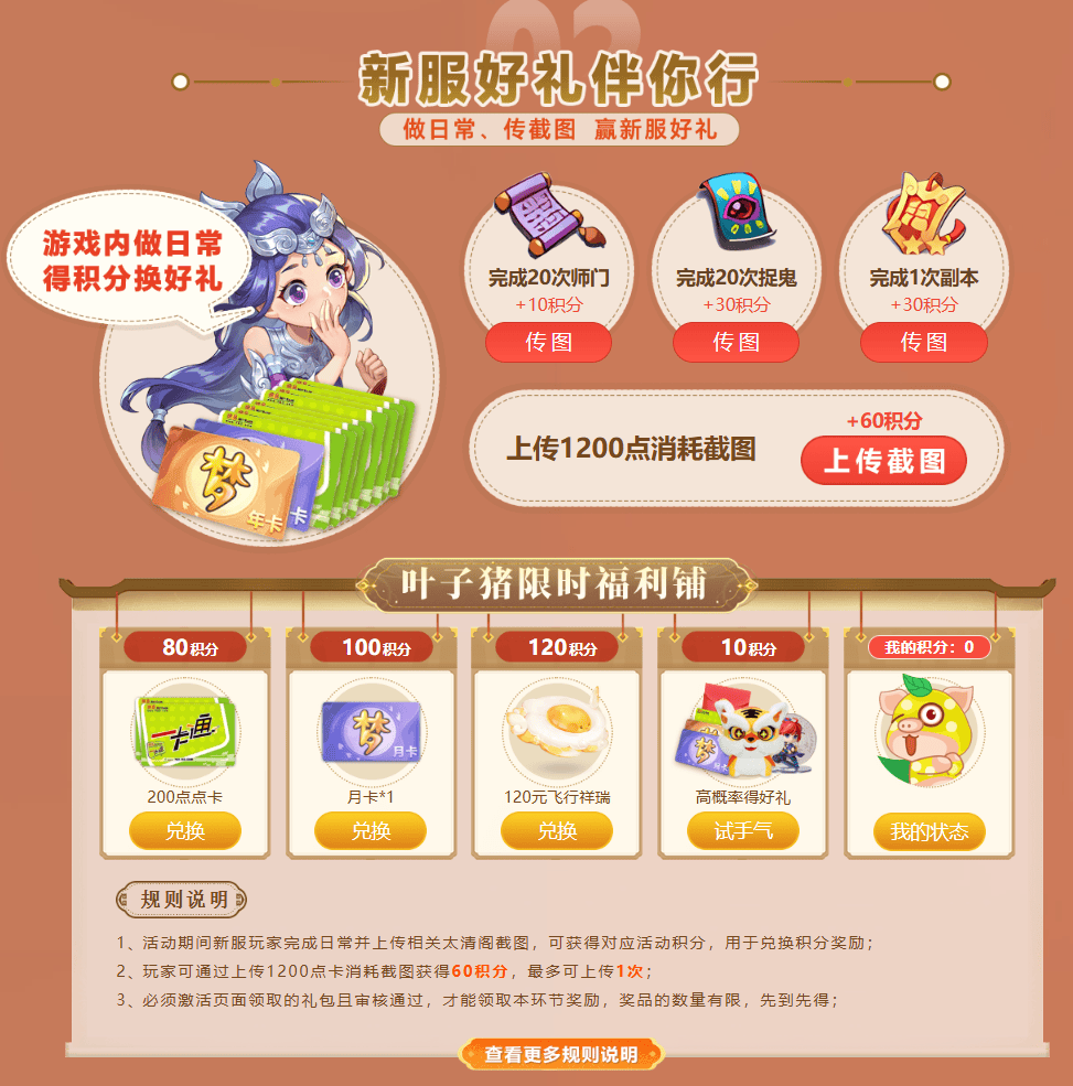对于刚刚起号的玩家来说,最需要的就是月卡或者飞行祥瑞。因此,你在游戏内完成20次师门、20次抓鬼、1次副本等日常任务,并上传1200点消耗截图,就可以在“新服好礼伴你行”活动中获得120点积分。这些积分不仅可以用来兑换点卡、月卡,还可以直接兑换价值120元的飞行祥瑞,奖品数量有限,先到先得哦!