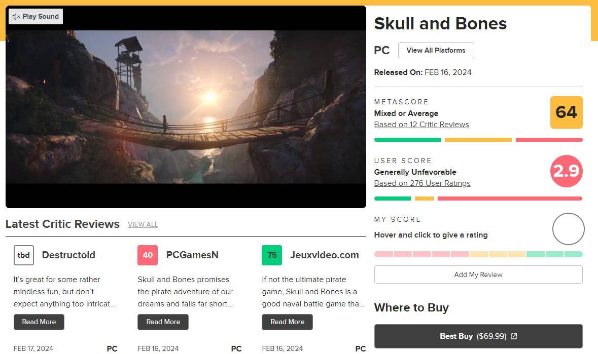 知名评分网站Metacritic上,《碧海黑帆》获得了64分(满分100分)的总体评分,但用户评分仅为2.9分(满分10分),为M站自2024年以来所评分的游戏中,按用户评分排名的最后一名。