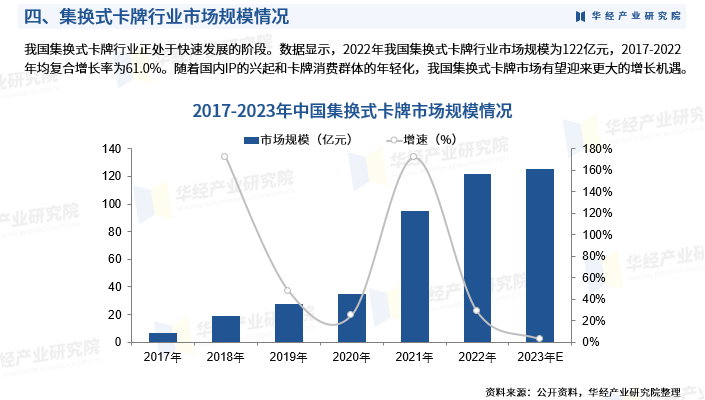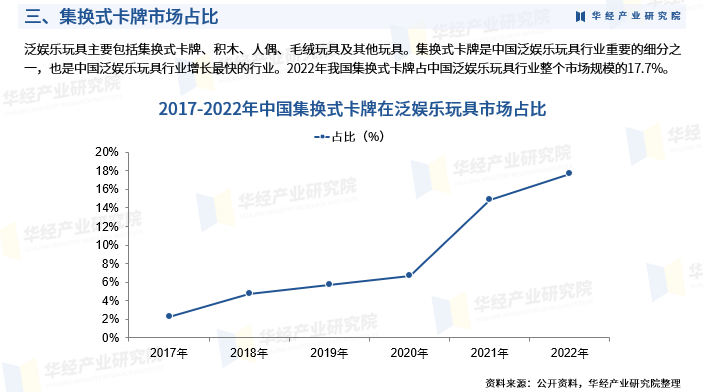 集换式卡牌是中国泛娱乐玩具行业重要的细分之一,也是中国泛娱乐玩具行业增长最快的行业。2022年我国集换式卡牌占中国泛娱乐玩具行业整个市场规模的17.7%。数据显示,2022年我国集换式卡牌行业市场规模为122亿元,2017-2022年均复合增长率为61.0%。随着国内IP的兴起和卡牌消费群体的年轻化,我国集换式卡牌市场有望迎来更大的增长机遇。