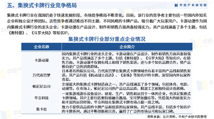 集换式卡牌行业在我国仍处于快速发展阶段,市场竞争格局不断变化。目前,该行业的竞争者主要包括一些国内外知名企业和独立设计师团队。这些竞争者通过推出不同主题、不同风格的卡牌产品,吸引着广大玩家用户。卡游动漫作为国内集换式卡牌行业的龙头企业,卡游动漫在产品设计、制作和销售方面具备较强实力。其产品线涵盖了多个主题,包括《奥特曼》、《斗罗大陆》等知名IP。