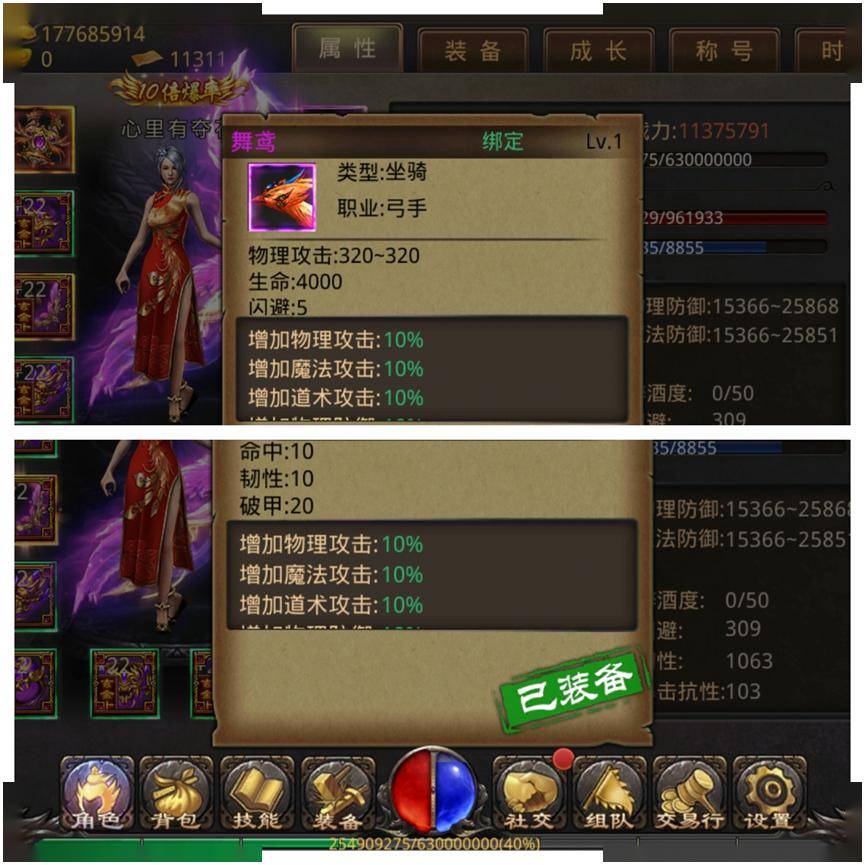 此外,坐骑的基础属性虽然不叠加,但是物理攻击320~320、生命4000、闪避:5、命中10、韧性10、破甲20这些额外属性是叠加的。