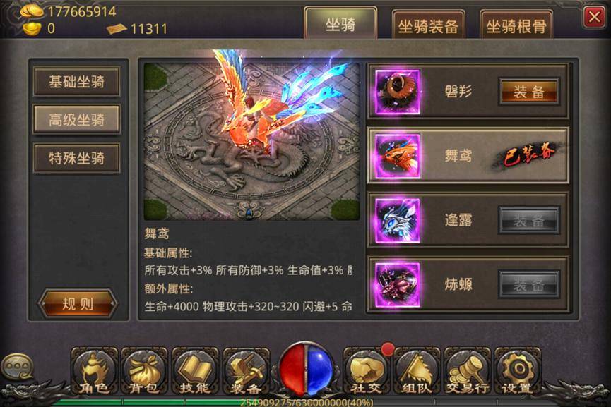 我们可以打开人物面板,点击成长——坐骑——高级坐骑,在这里,我们不仅可以查看舞鸢的各项属性,还可以查看舞鸢的动态特征。