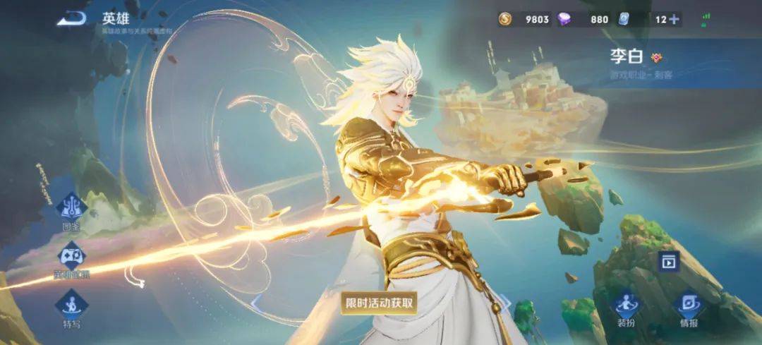技能特效:一技能化作金芒向前突进,金色能量汇聚而成的分身于原地潇洒舞剑。二技能金色能量丝线连绵环绕水面,倒映出琉璃幻景,在圈中移动时,可以从不同角度观看盛景奇观。三技能呈现出四道金色分身幻化十字斩击和巨剑从天而降击碎琉璃幻景两种不同的形式。