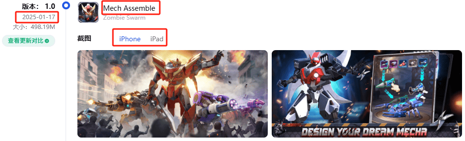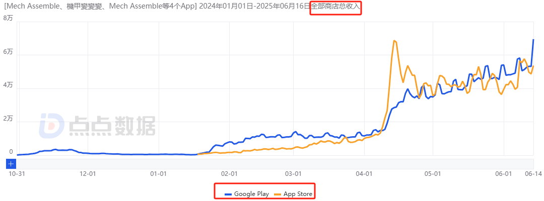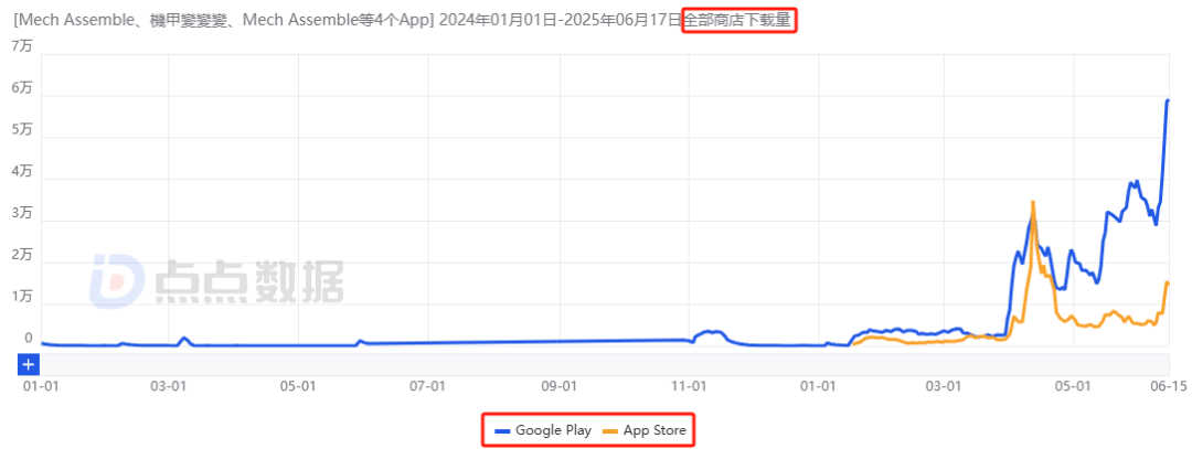 点点数据显示,《Mech Assemble》最早于2023年12月中旬上架美国Google Play,当时还是以《Mecha Rogue》的游戏名进行前期素材及玩法的验证。