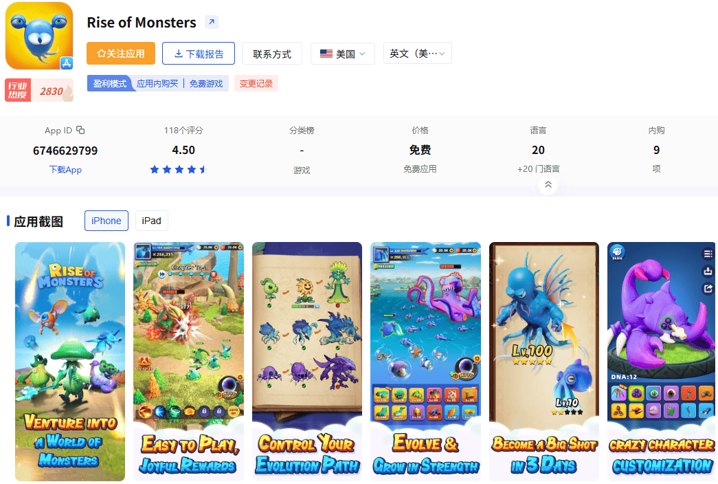 《Rise of Monsters》目前累计下载量在24万左右,美国、巴西以23.51%、10.56%的占比位列前两位,总流水预估超70万,美国占比为47.98%,英国和澳大利亚紧随其后。
