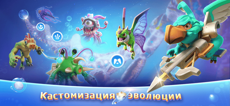 首先是《War of Evolution》,游戏初始融入了io类大鱼吃小鱼的副玩法,玩家通过吃鱼升级并获得DNA点数,可以像组建战舰一样定制生物的外观,随后引入SLG玩法,关卡战斗则是采用塔防玩法,过程中玩家可以给生物转配不同的器官从而让生物获得特定的技能。