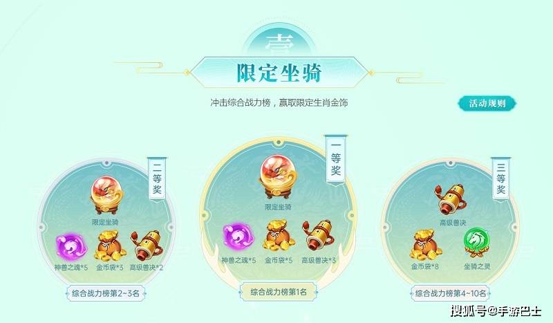 第1名:限定坐骑+神兽之魂*5+金币袋*5+高级兽诀*3