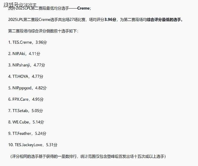 随着lpl赛区第二赛段选手均分的出炉,这个事情被印证了。先来看一下倒数的排行榜,排在倒数第一的就是Tes战队的中单选手小奶油,综合平均分数只有3.96分,也是唯一一个下四的选手。毋庸置疑,小奶油绝对是目前团队问题最大的选手,甚至从语音中就能够感觉得到tes战队的众人都在照顾他的情绪,属于那种操作不怎么样,情绪还非常不稳定的玩家。AD位置的阿水也进了倒数的前十名,他的分数是5.31分,但感觉tes战队更换它的概率是非常低的,毕竟来到tes战队之后,他就从来没有替补过。