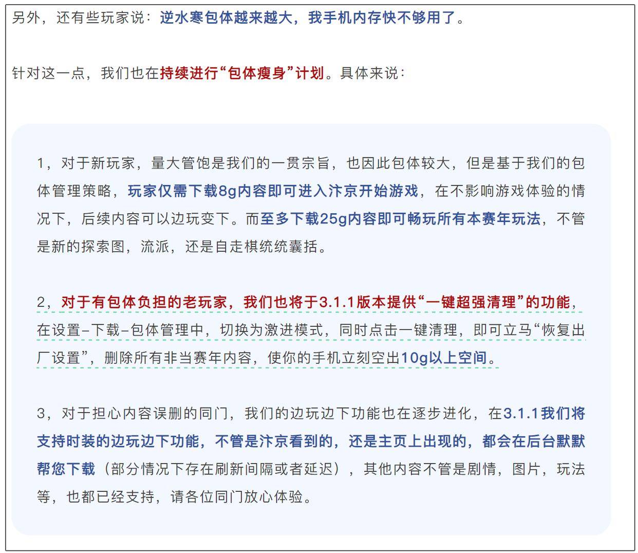 对此种担心,官方表示会持续进行“包体瘦身计划”,通过8G简化版本、一键超强清理功能、边玩边下载等功能,让玩家的手机负担不是那么严重。