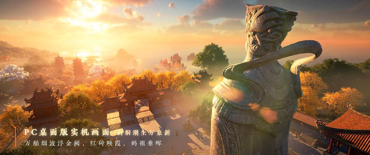 刺桐港在面积上有6-7个汴京那么大,在游戏画质迭代后,可以看到,刺桐港光影效果展示惊人,当玩家踏入刺桐港,一座高达 30 米的妈祖巨像瞬间映入眼帘,在夕阳余晖的映照下,妈祖和港口相互依望、互成牵挂。