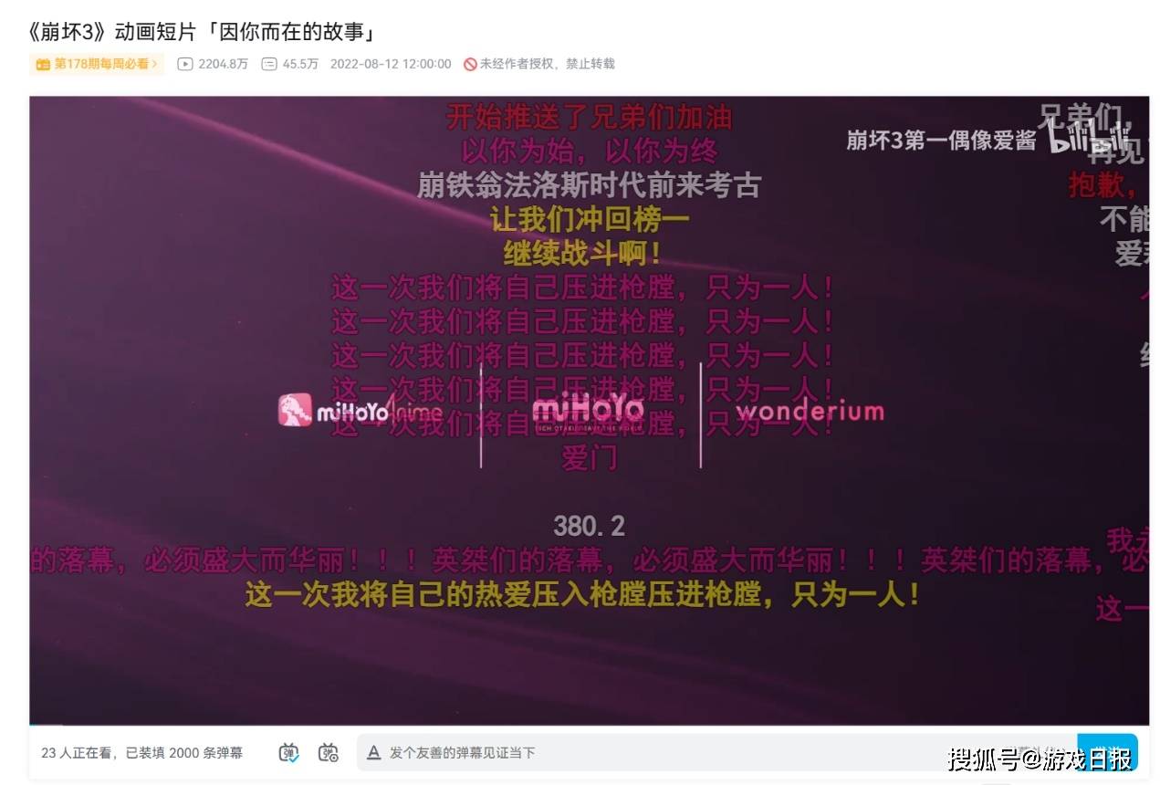 至于第二点,跳过功能与剧情的受重视程度同样构不成联系,以同一IP下的《崩坏3》为例,从剧情到CG都能跳过,非但没有影响《崩坏3》的剧情质量,还塑造出了诸如爱莉希雅这样的人气角色,她的动画短片《因你而在的故事》单B站平台就已累计2200余万的播放量,弹幕数达到了恐怖的45.5万,剧情的受关注程度并没有受到影响。