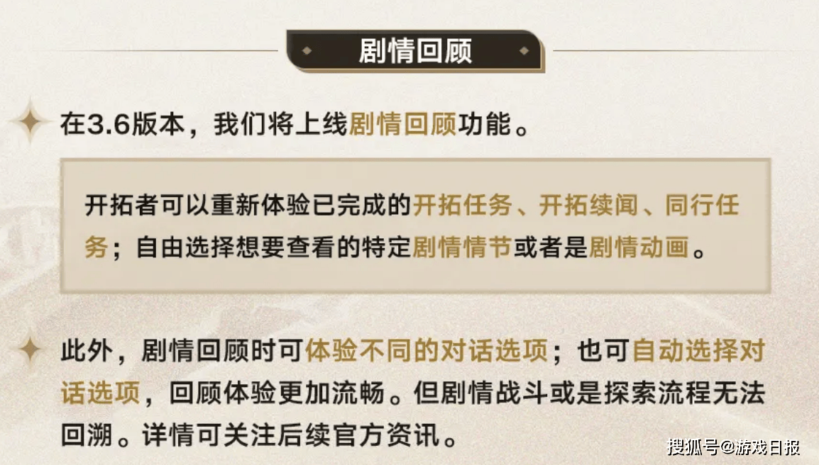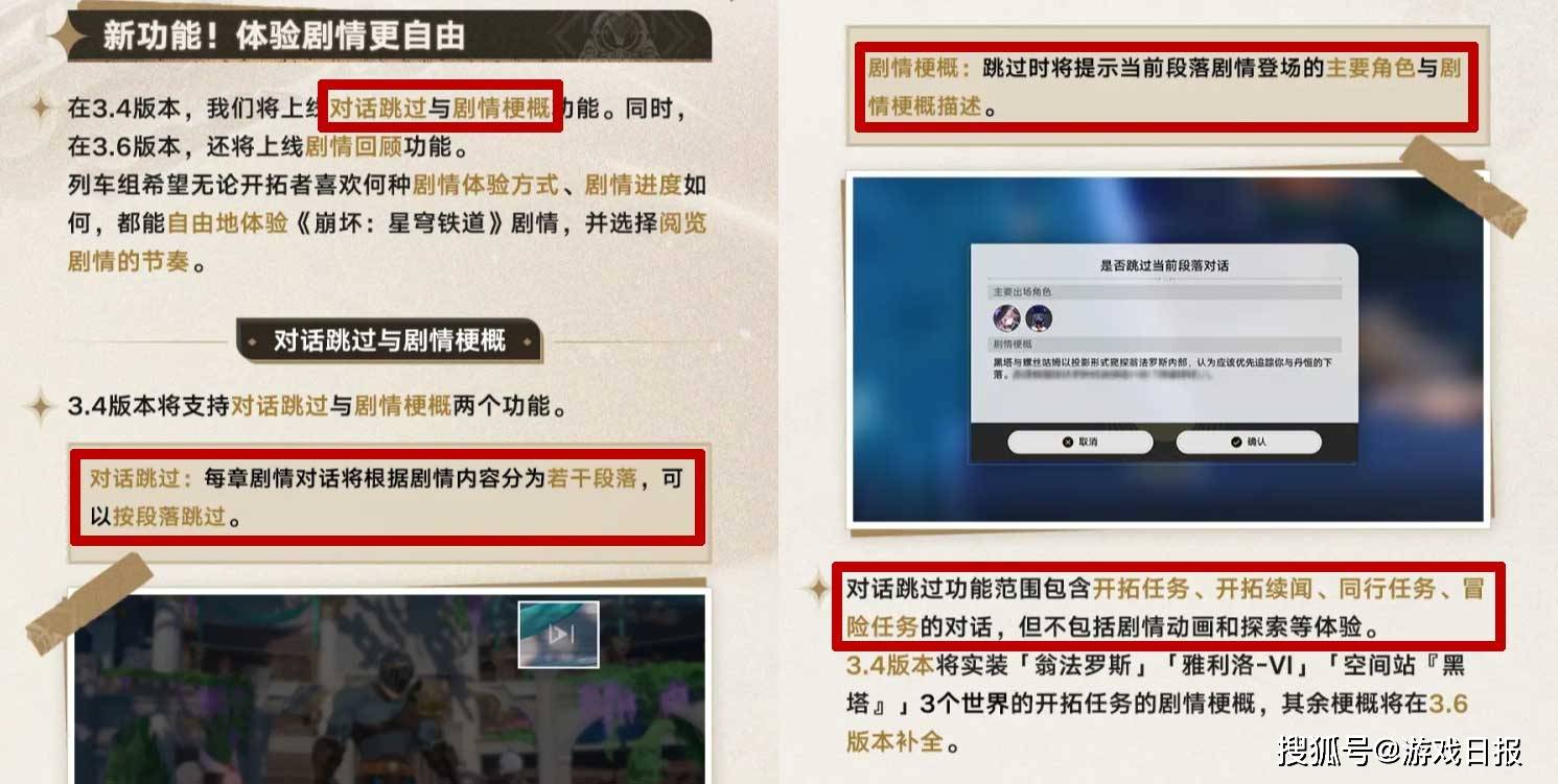实际上根据公告及前瞻,新功能是“对话跳过”而非“剧情跳过”,包括剧情动画、探索等环节无法跳过,仍需要游玩体验,允许跳过的对话也将新增“剧情梗概”功能,保证玩家能了解跳过的部分发生了什么。