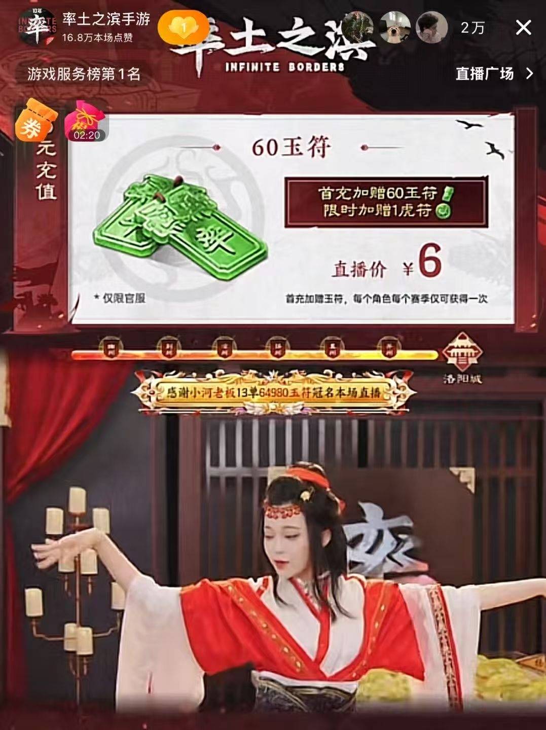 也是没有注意的时候,率土之滨已经达到了游戏服务榜第1名的位置,2万多人的在线观看,我们率土玩家不要太爱了!当然本次直播不仅是给玩家们送免费的福利,更是有强大的充值福利,买64980虎符送16245+1086虎符,相当于7折购入原价商品,直播间里的大哥们也纷纷入身其中,爽爽得采购一波。率土,你这是把电商的营销带到游戏内吗?这是想让SLG同行们都卷起来,给玩家们争取更大的福利是吗!