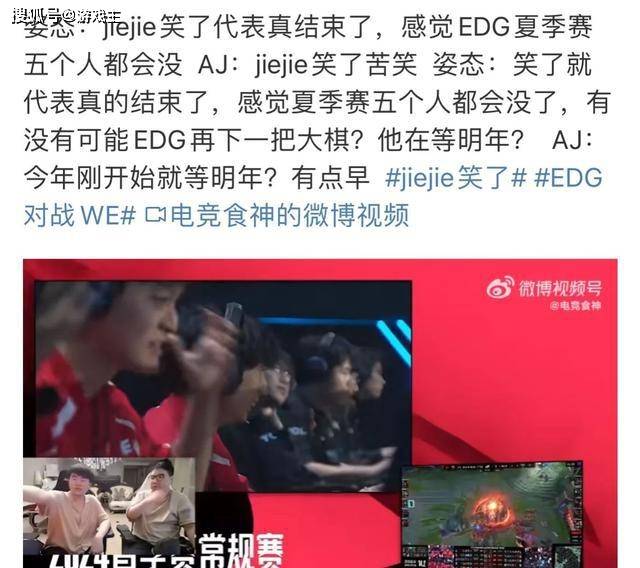 大家好,s14赛季的比赛已经正式开始了,相信绝大多数的玩家都关注了最近一段时间的对抗。Edg战队作为lpl赛区的老牌强队,在本次春季赛的状态并不是特别的好,甚至在年前的比赛中还拿到了一个五连败。春节假期结束之后,edg战队早早的进入了训练状态,选手们也肯定想要拿到一次比赛的胜利,但是和we战队的比赛中,edg战队依旧没有获胜,不在今天的热搜还在持续,握手环节打野选手杰杰的笑容也证明了他彻底释怀了,很多人都在调侃,为什么让四个天才和杰杰一起打比赛?