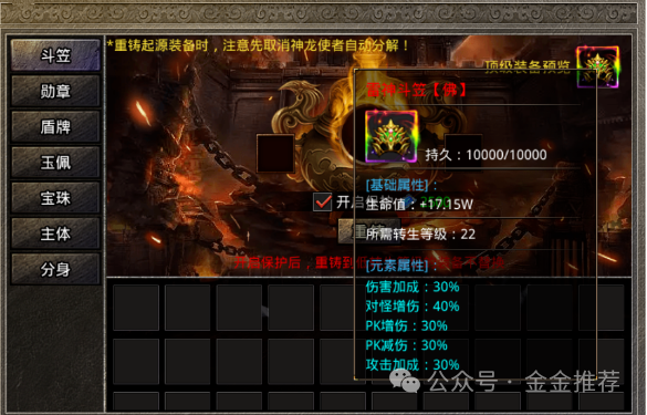 然后就是转生的事了,转生成功能给你带来实实在在的属性加成,但这也离不开人物等级和转生材料。每一次转生都会降十级,所以咱们前期辛辛苦苦打到的经验丹可得省着点儿用,等攒够了转生材料再说呗~