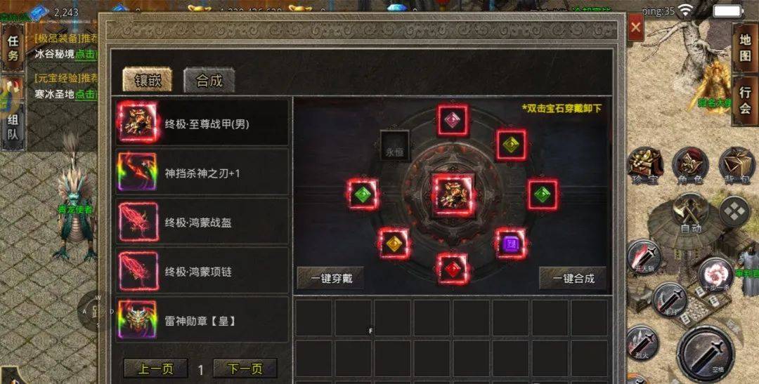 还有个就是宝石系统,每天获得的宝石可以装备到装备上,建议把宝石升到盘古等级,因为这样会有百分比攻击。盘古以下等级可以直接合成!