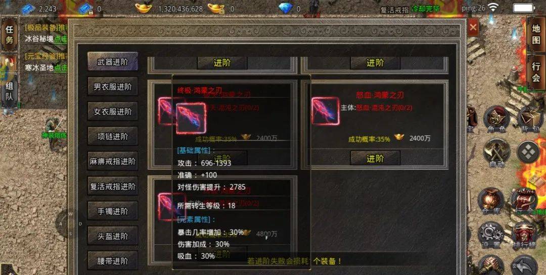 第三个升级的就是神兵系统,这个每天的魔龙活动会有爆出图纸。提升的是攻击防御还有生命。虽然攻击提升的不是很多,但把等级提升到最高级提升还是很大的!