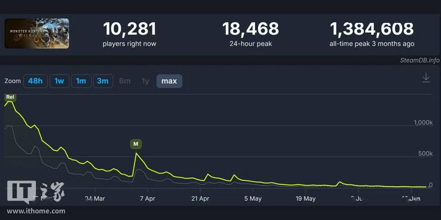 IT之家 6 月 22 日消息,自 2 月 28 日上线以来,卡普空旗下的动作角色扮演游戏《怪物猎人:荒野》在 Steam 平台的热度急转直下。据 SteamDB 数据显示,截至 6 月 21 日,该游戏 24 小时内的最高同时在线人数仅为 18,468 人,与 2 月 25 日达到的 138 万峰值相比,玩家数量锐减了 98.67%。除了玩家数量锐减,该游戏近期还遭遇了大规模的差评轰炸。