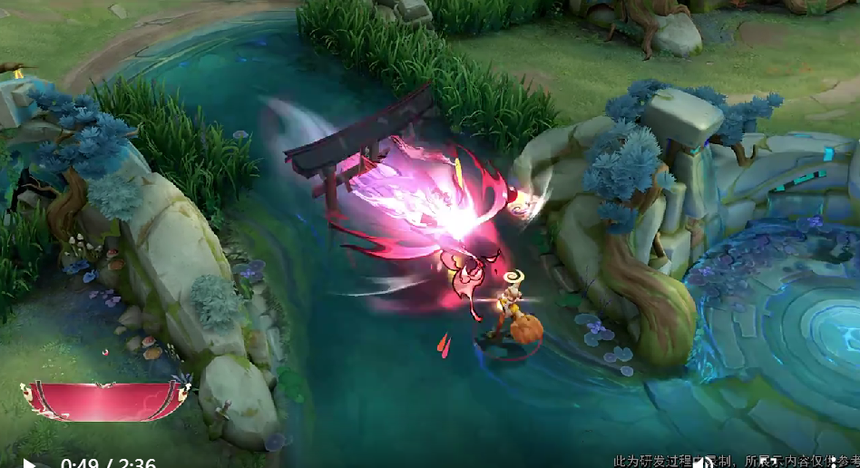 月亮元素不仅体现在人物建模和装扮上,还体现在技能特效中。火舞的普通攻击时月亮时隐时现,一技能二技能均有旋转的月亮实体出现。大招就更加厉害,引进了妖怪元素。当火舞释放大招,妖怪在火舞周围,并且和火舞一起冲锋,这种视觉效果展现了火舞百妖之主的身份。此外,火舞只有在回城的时候天上出现满月,其他时候都是残月。