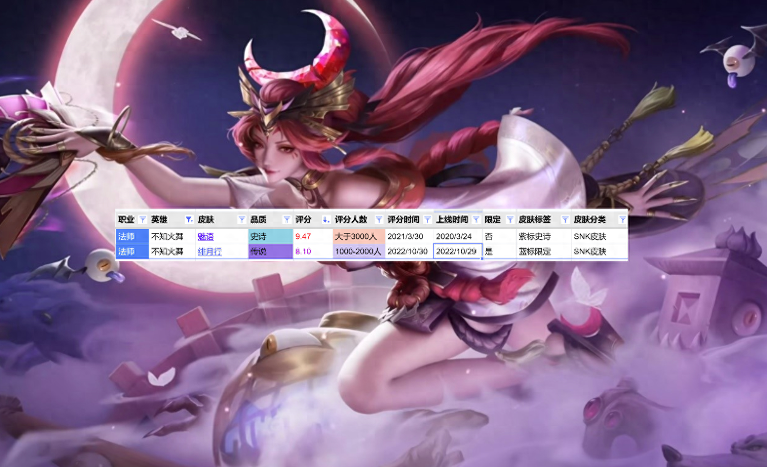 和火舞热度不对称的是她的皮肤很少,至今只有两款,但两款皮肤却都是精品,平均评分接近9分。2022年11月初,不知火舞的绯月行上线,这款皮肤定位传说,玩家给他打出了8.1分的高分。绯月行之所以拿到高分,应该和她的中国风设计有关系,建模好看的同时,皮肤的打击感很强,玩家都喜欢用。其中红色的头发和头顶的月亮也是设计上的亮点。