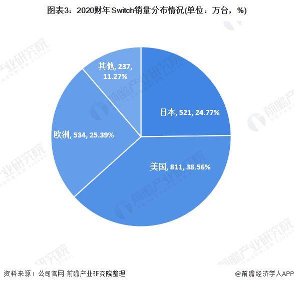 2020财年,任天堂Switch销量主要分布在美国、欧洲和日本。其中,2020财年Switch在美国销量为811万台,占Switch总销量的38.56%;在欧洲地区销量534万台,占比25.39%;在日本销量为521万台,占比24.77%。