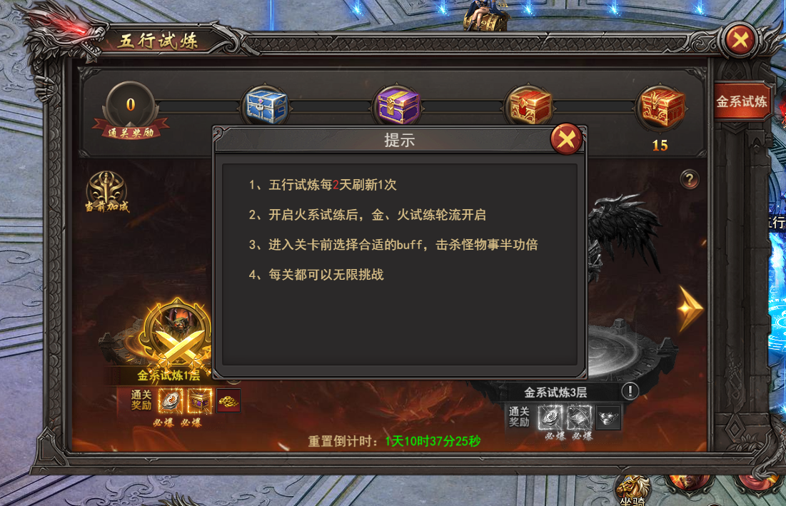 1. 今天给大家介绍的王者之心2火系试炼,五行十连每两天刷新一次,开启火系试炼后,金、火试炼轮流开启。