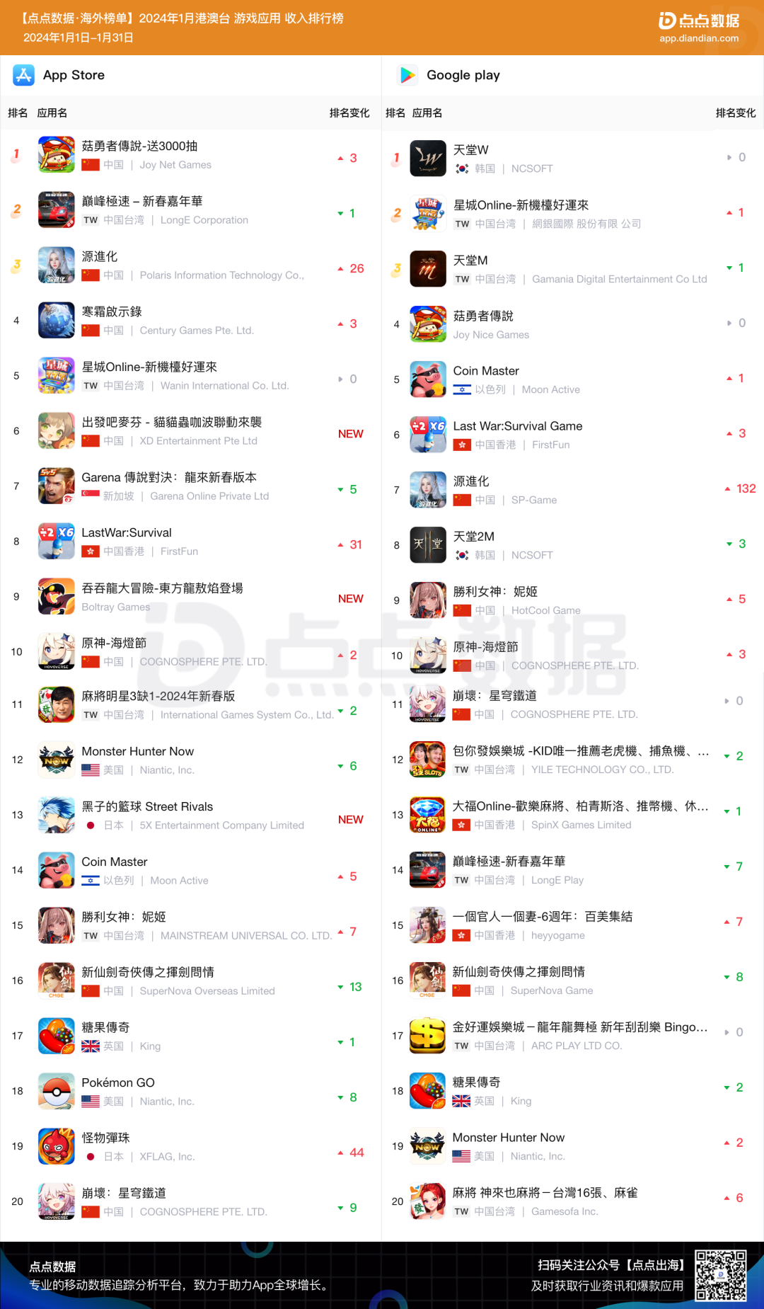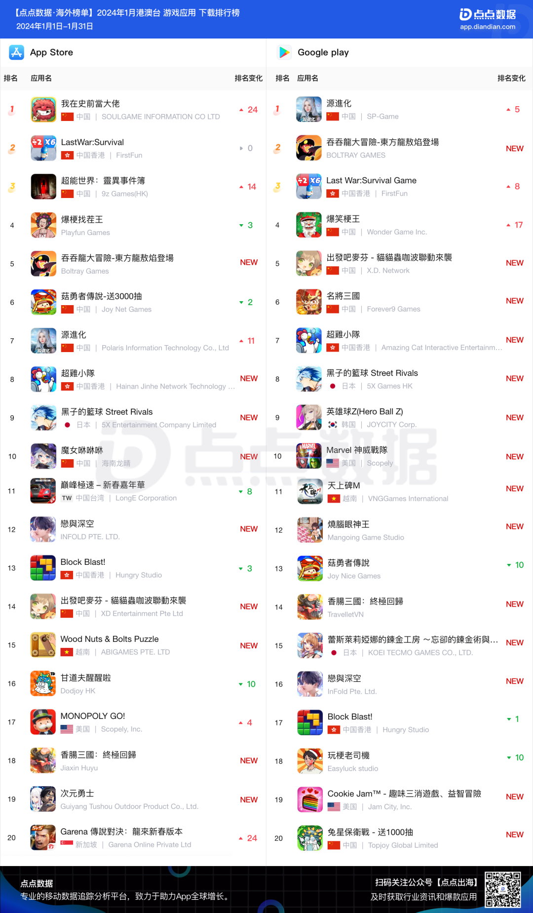 统计周期内,露珠游戏旗下去年12月上线的赛博都市风异能MMO手游《源進化》上月一举登顶港澳台地区手游下载冠军,其双平台月下载总量超过42万,并同时问鼎该地区Google Play1月手游下载冠军。App Store手游下载冠军则由北京魂世界在去年10月发行的史前世界题材部落冒险手游《我在史前當大佬》获得。