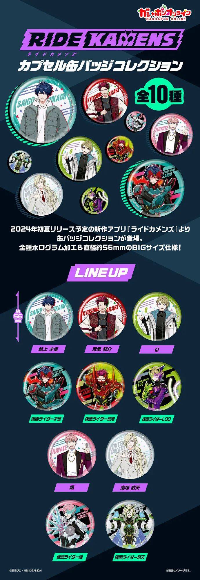 之后的话就是手游『RIDE KAMENS』的周边了,这里也是依照已经公开的五位骑士以及五位变身者做了10种不同的徽章周边,看着还是非常不错的,不过对于一部分对这个新手游不感兴趣的粉丝来说还是非常不感冒的,对此也是有不少粉丝吐槽,这波游戏都还没有出来,相关的周边都已经提上日程了。留言说说你们的看法吧。
