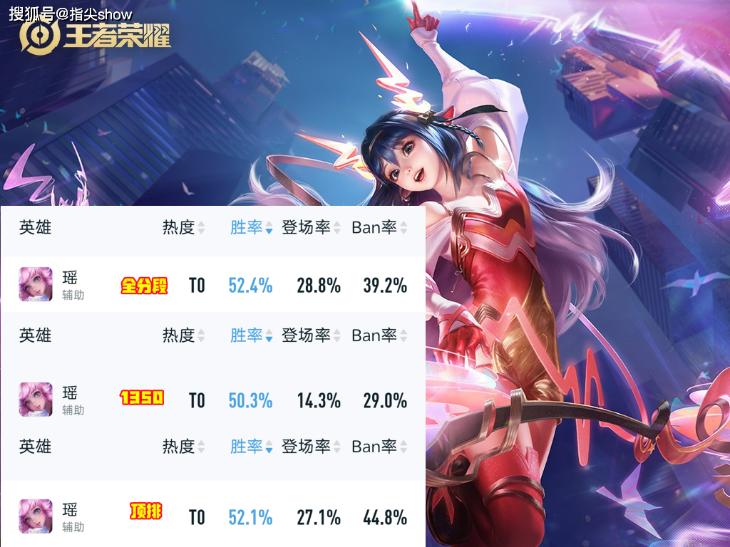 说实话,看到瑶妹最新数据时着实让我惊讶了一下,不知道从什么时候开始,瑶的胜率全分段超过了50%,甚至全分段和顶端排位都超过了52%,加上这个不俗的胜率,如果放在其他英雄身上,估计都要大呼一声超标了吧。