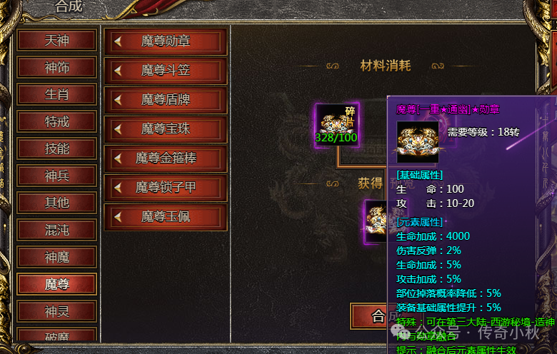 魔尊装备和神魔装备是一种类型,只是魔尊装备是融合在神饰上的。在合成系统中,用对应的魔尊碎片合成,再分别有魔尊勋章、斗笠、盾牌、宝珠、金箍棒、锁子甲、玉佩。