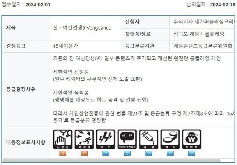 据Gematsu报道,《真女神转生V 复仇》在韩国通过分级,描述中称是《真·女神转生V》的完整版本,对原作进行了改进和内容追加。不过没多久韩国分级官网上就查不到该信息了。