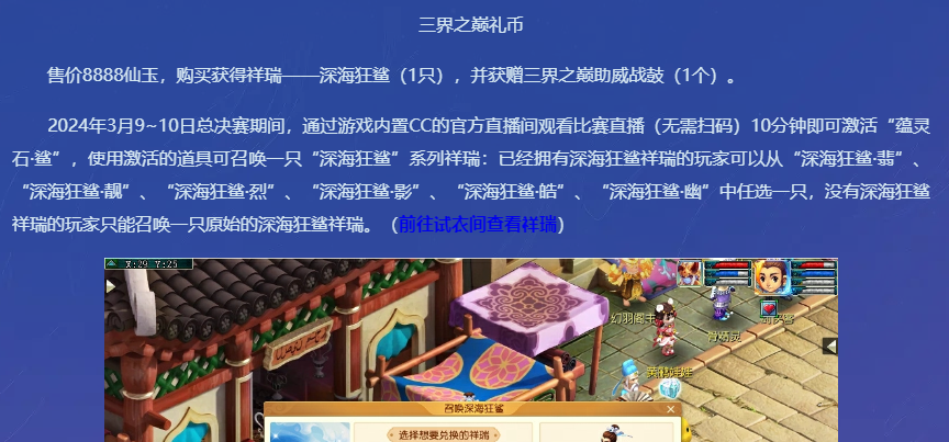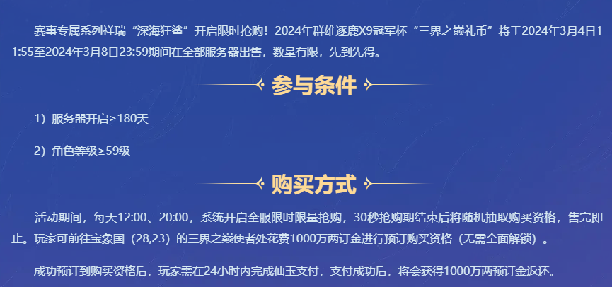 除此之外,线下祥瑞深海狂鲨也将在群雄逐鹿冠军杯开启限时抢购,有想要购买的少侠们(服务器开启超过180天,角色等级≥50级)可以在2024年3月4日11:55到3月8日23:59,每天的12:00,20:00的三界之巅使者处(宝象国28.23)开启限时限量抢购“蕴灵石·鲨”。