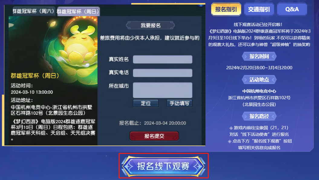 此次线下名额可以直接在专题页上报名,也可以游戏内报名,2024年2月20日8:00~3月4日20:00期间在游戏内前往宝象国21.21(线下活动使者)处点击对话,选择“报名参加近期活动”,填写真实姓名、电话以及自己的位置,即可参与报名。