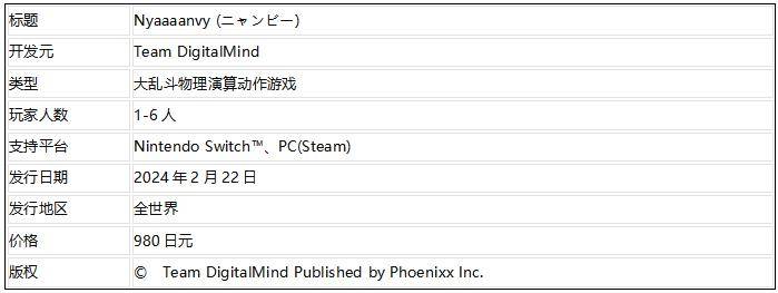 株式会社Phoenixx(位于东京都武藏野市,代表取缔役社长:坂本和则)宣布,该公司发行的动作游戏《Nyaaaanvy》的Nintendo Switch™版和Steam版将于2024年2月22日发售,而Nintendo Switch™版已于2月15日开始接受预订。