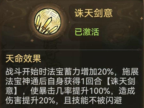 全剑修通用的职业天命,施展法宝后提高100%暴击和20%造伤,托它的福,造就了如今剑修的最暴力输出的局面。