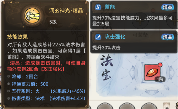 但要注意的是,玩晶石的话,李清圣必须要堆暴击,要保证每次释放法宝时,都可以触发【蓄能】、【攻击强化】