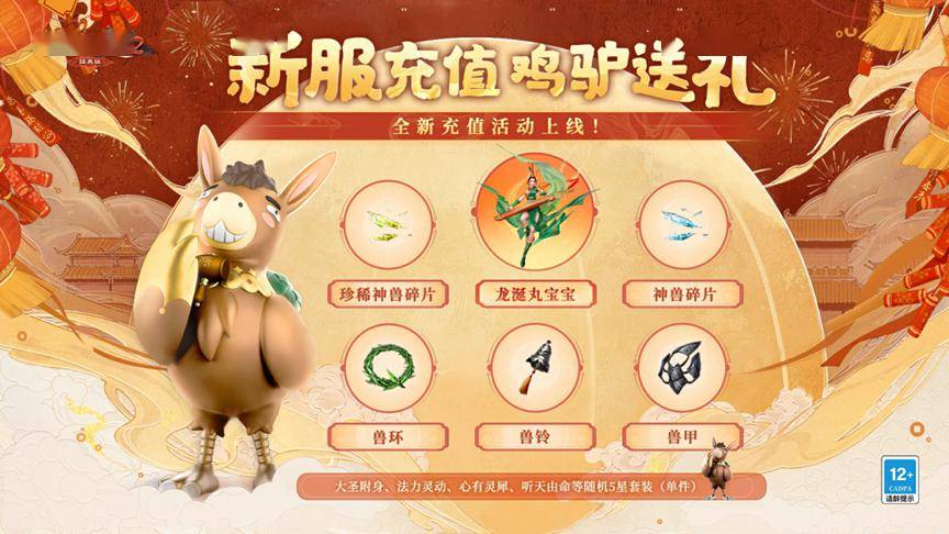 新服预约开启~开服第10天23:59给账号进行充值专用点,活动期间内人物等级达到50级后即可参与活动,抽奖有机会抽取5星大圣附身、5星法力灵动、5星心有灵犀、5星听天由命等兽装、神兽碎片、一级神兵、一阶仙器、龙之骨、神兵石、超级金柳露、筋骨提气丸、六魂之玉、补天神石、亲密丹等奖励。