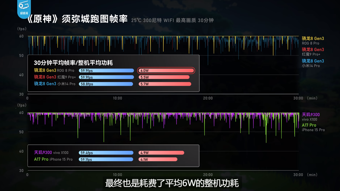 而从实际表现来看,ROG游戏手机8也没有让人失望。根据极客湾 的测试,ROG游戏手机8在运行《原神》时,半小时平均帧率高达59.9帧,帧率基本没有明显波动。作为对比,搭载了A17 Pro芯片的iPhone15 Pro,帧率只有59.1帧。对于追求极致体验的玩家而言,这点差距是非常大的。