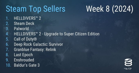 2024年第8周Steam周销榜TOP10: