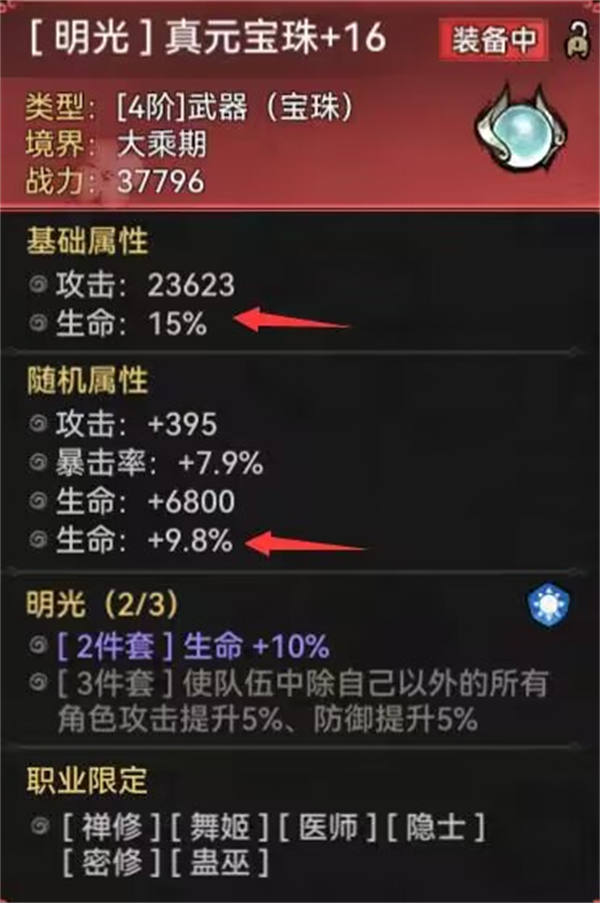 二阶装备推荐: 两明光 两金刚/三金刚 剩下一件优先考虑随机属性加百分比血量或者防御。武器位置:宝珠。