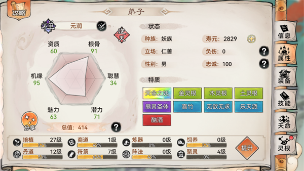 禅修因为其独特的被动技能:金刚不坏:受到致命伤害时会保留1点血量持续一会合相当于一回合无敌,天命使其成为了最强祖师中最肉的职业。因为其职业为禅修定位前排职业,所以不太需要效果命中,为了提高元润的抵抗我们可以通过喂养各种酒让他获得嗜酒特质,进一步提高其效果抵抗能力。
