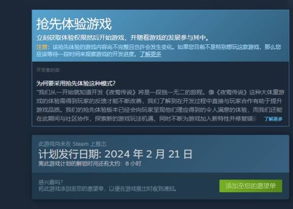 然后进入steam商城搜索《夜莺传说》,可以看到游戏目前还并未发行,也就是尚未在steam上推出。而根据steam商店的信息,即将在2月21日发售。我们喜欢这款游戏的玩家可以等待发售之后购入下载即可游玩夜莺传说了!