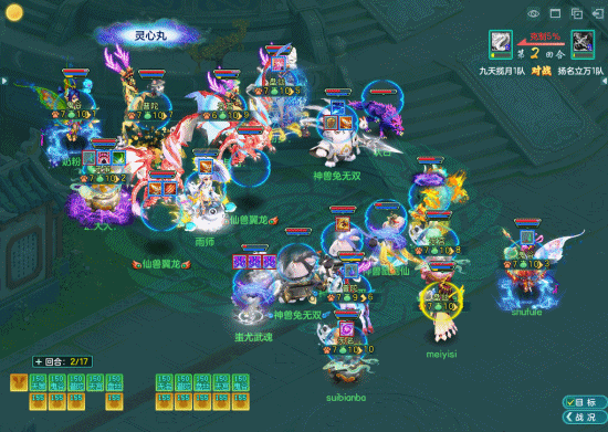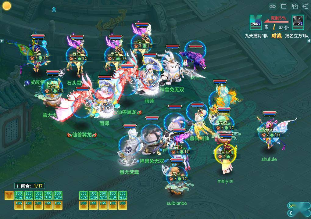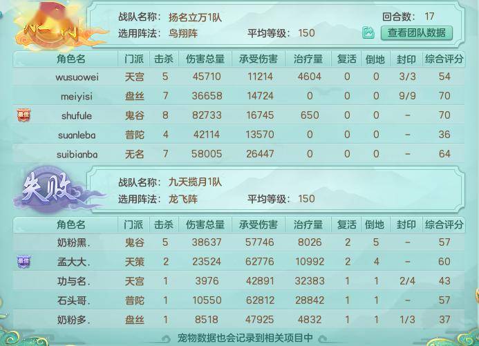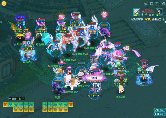 第3回合,观战方天宫“毁天灭地”配合鬼谷“岩迟”将对战方天策击倒;第5回合,天宫“画地为牢”配合无名“锢神”再次击倒天策。血量、封印和宠物的多重压力使天策难以发挥出应有的作用,观战方拿到了前期优势。