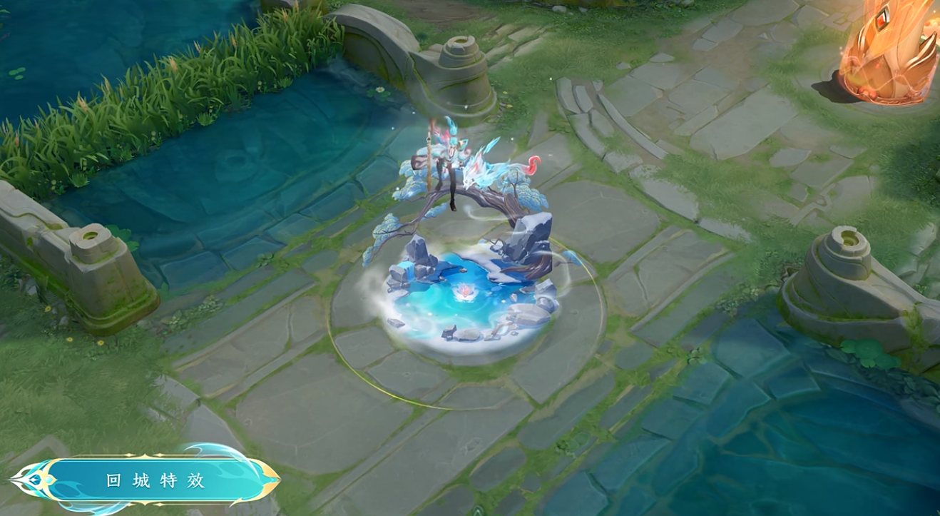 ❅三技能:亚连跳跃空中时,选定目标时地面中心会出现莲花绽放以及冰山和风雪的设计,下落时会有白狼出现和莲花及地面莲花为设计点的装饰花纹。防护罩以白狼图腾和冰雪为设计点。